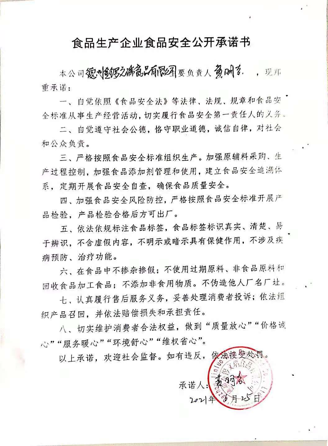 臨沂金鑼文瑞食品安全承諾書(shū)